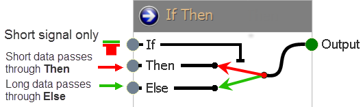 The IF THEN node acts like a switch. The switch is controlled by the IF connector. When a signal comes in, what ever is connected to the THEN connector passes through to the Output. When there is no signal, what ever is connected to the ELSE connector passes through to the Output. Either the THEN or ELSE always passes through to the Output. The Long output and Short output each have their own switch inside the IF THEN and are evaluated separately.